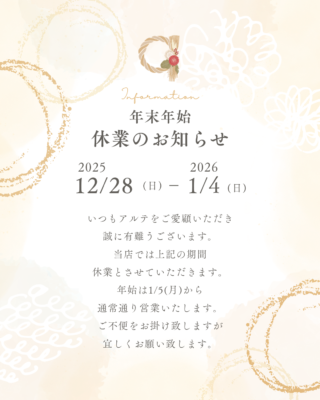 また本年12月28日〜翌年1月4日まで約1週間ほどお休みをいただきます。